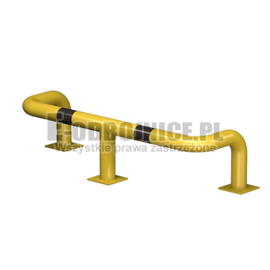 Odbojnica przemysłowa U-3, średnica rury 76,1 mm, lakierowane proszkowo na kolor żółty, pasy z czarnej foli odblaskowej I-generacji. Służą one do zabezpieczenia słupów, ścian, urządzeń, rur itp... Stosowane na powierzchniach produkcyjnych, magazynowych, parkingowych itp.... Odbojnica jest osadzona na trzech nogach. Każda stopa posiada cztery otwory montażowe o średnicy 10 mm. Stopa wykonana z blachy grubości 8 mm.