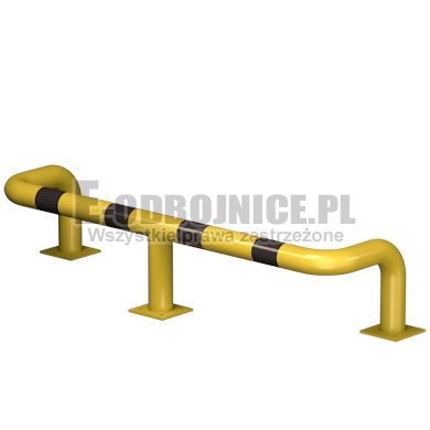 Odbojnica przemysłowa U-3, średnica rury 76,1 mm, lakierowane proszkowo na kolor żółty, pasy z czarnej foli odblaskowej I-generacji. Służą one do zabezpieczenia słupów, ścian, urządzeń, rur itp... Stosowane na powierzchniach produkcyjnych, magazynowych, parkingowych itp.... Odbojnica jest osadzona na trzech nogach. Każda stopa posiada cztery otwory montażowe o średnicy 10 mm. Stopa wykonana z blachy grubości 8 mm.