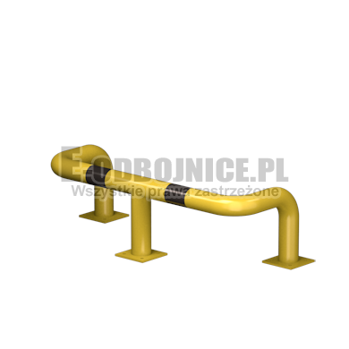 Odbojnica przemysłowa U-3, średnica rury 76,1 mm, lakierowane proszkowo na kolor żółty, pasy z czarnej foli odblaskowej I-generacji. Służą one do zabezpieczenia słupów, ścian, urządzeń, rur itp... Stosowane na powierzchniach produkcyjnych, magazynowych, parkingowych itp.... Odbojnica jest osadzona na trzech nogach. Każda stopa posiada cztery otwory montażowe o średnicy 10 mm. Stopa wykonana z blachy grubości 8 mm.