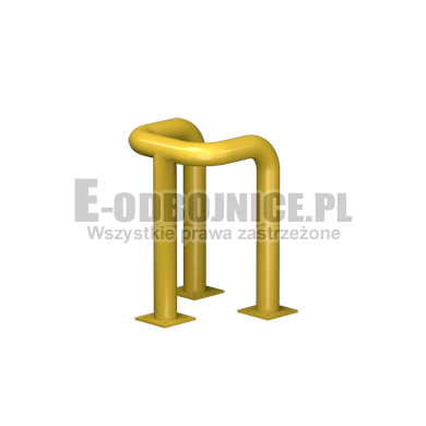 Odbojnica przemysłowa U-3, średnica rury 76,1 mm, lakierowane proszkowo na kolor żółty, pasy z czarnej foli odblaskowej I-generacji. Służą one do zabezpieczenia słupów, ścian, urządzeń, rur itp... Stosowane na powierzchniach produkcyjnych, magazynowych, parkingowych itp.... Odbojnica jest osadzona na trzech nogach. Każda stopa posiada cztery otwory montażowe o średnicy 10 mm. Stopa wykonana z blachy grubości 8 mm.