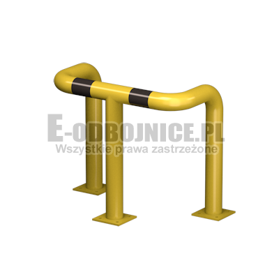 Odbojnica przemysłowa U-3, średnica rury 76,1 mm, lakierowane proszkowo na kolor żółty, pasy z czarnej foli odblaskowej I-generacji. Służą one do zabezpieczenia słupów, ścian, urządzeń, rur itp... Stosowane na powierzchniach produkcyjnych, magazynowych, parkingowych itp.... Odbojnica jest osadzona na trzech nogach. Każda stopa posiada cztery otwory montażowe o średnicy 10 mm. Stopa wykonana z blachy grubości 8 mm.