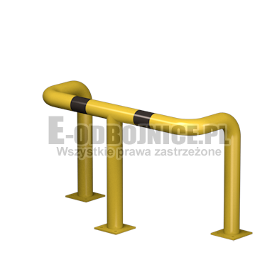 Odbojnica przemysłowa U-3, średnica rury 76,1 mm, lakierowane proszkowo na kolor żółty, pasy z czarnej foli odblaskowej I-generacji. Służą one do zabezpieczenia słupów, ścian, urządzeń, rur itp... Stosowane na powierzchniach produkcyjnych, magazynowych, parkingowych itp.... Odbojnica jest osadzona na trzech nogach. Każda stopa posiada cztery otwory montażowe o średnicy 10 mm. Stopa wykonana z blachy grubości 8 mm.
