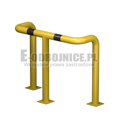 Odbojnica przemysłowa U-3, średnica rury 76,1 mm, lakierowane proszkowo na kolor żółty, pasy z czarnej foli odblaskowej I-generacji. Służą one do zabezpieczenia słupów, ścian, urządzeń, rur itp... Stosowane na powierzchniach produkcyjnych, magazynowych, parkingowych itp.... Odbojnica jest osadzona na trzech nogach. Każda stopa posiada cztery otwory montażowe o średnicy 10 mm. Stopa wykonana z blachy grubości 8 mm.