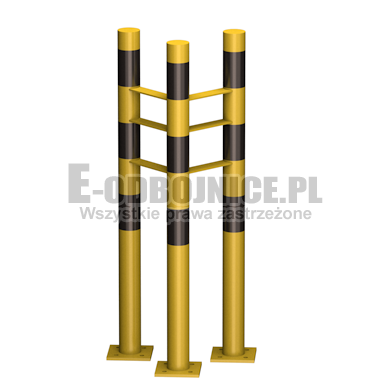 Odbojnice przemysłowe narożne, średnica rury 60,3 mm, wysokość 900 mm wymiary wewnętrzne do wyboru, lakierowane proszkowo na kolor żółty, pasy z czarnej foli odblaskowej I-generacji. Służą one do zabezpieczenia słupów, rur, instalacji, narożników itp... Stosowane na powierzchniach produkcyjnych, magazynowych, parkingowych itp.... Odbojnica jest osadzona na czterech nogach. Każda stopa posiada cztery otwory montażowe o średnicy 10 mm. Stopa wykonana z blachy grubości 8 mm. Schemat pokazuje jak mierzymy wymiary wewnętrzne: