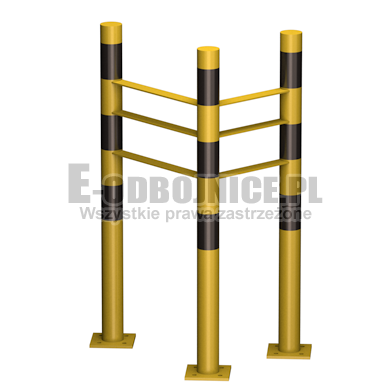 Odbojnice przemysłowe narożne, średnica rury 60,3 mm, wysokość 900 mm wymiary wewnętrzne do wyboru, lakierowane proszkowo na kolor żółty, pasy z czarnej foli odblaskowej I-generacji. Służą one do zabezpieczenia słupów, rur, instalacji, narożników itp... Stosowane na powierzchniach produkcyjnych, magazynowych, parkingowych itp.... Odbojnica jest osadzona na czterech nogach. Każda stopa posiada cztery otwory montażowe o średnicy 10 mm. Stopa wykonana z blachy grubości 8 mm. Schemat pokazuje jak mierzymy wymiary wewnętrzne: