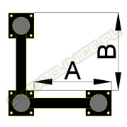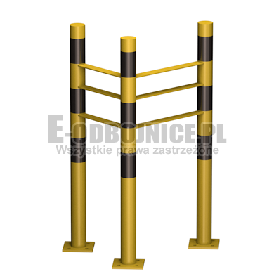 Odbojnice przemysłowe narożne, średnica rury 60,3 mm, wysokość 900 mm wymiary wewnętrzne do wyboru, lakierowane proszkowo na kolor żółty, pasy z czarnej foli odblaskowej I-generacji. Służą one do zabezpieczenia słupów, rur, instalacji, narożników itp... Stosowane na powierzchniach produkcyjnych, magazynowych, parkingowych itp.... Odbojnica jest osadzona na czterech nogach. Każda stopa posiada cztery otwory montażowe o średnicy 10 mm. Stopa wykonana z blachy grubości 8 mm. Schemat pokazuje jak mierzymy wymiary wewnętrzne: