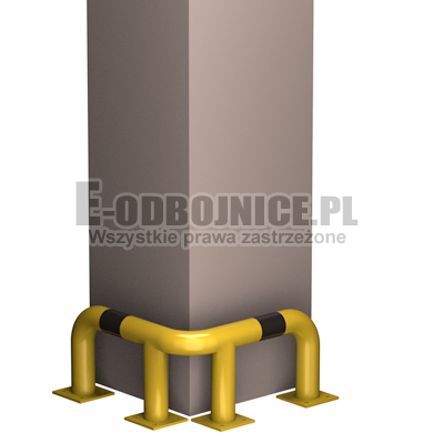 Odbojnica przemysłowa narożna wykonane z rur 76,1 mm, lakierowane proszkowo na kolor żółty , pasy z czarnej foli odblaskowej I-generacji. Służą one do zabezpieczenia ścian, urządzeń, traktów komunikacyjnych, słupów w powierzchniach produkcyjnych, magazynowych i sklepowych. Stopy wykonane z blachy o gr. 8 mm z czterema otworami montażowymi o średnicy 10 mm. Wysokość i długość ramion do wyboru.