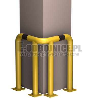 Odbojnica przemysłowa narożna wykonane z rur 76,1 mm, lakierowane proszkowo na kolor żółty , pasy z czarnej foli odblaskowej I-generacji. Służą one do zabezpieczenia ścian, urządzeń, traktów komunikacyjnych, słupów w powierzchniach produkcyjnych, magazynowych i sklepowych. Stopy wykonane z blachy o gr. 8 mm z czterema otworami montażowymi o średnicy 10 mm. Wysokość i długość ramion do wyboru.