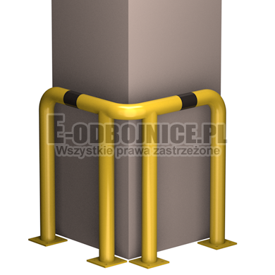 Odbojnica przemysłowa narożna wykonane z rur 76,1 mm, lakierowane proszkowo na kolor żółty , pasy z czarnej foli odblaskowej I-generacji. Służą one do zabezpieczenia ścian, urządzeń, traktów komunikacyjnych, słupów w powierzchniach produkcyjnych, magazynowych i sklepowych. Stopy wykonane z blachy o gr. 8 mm z czterema otworami montażowymi o średnicy 10 mm. Wysokość i długość ramion do wyboru.