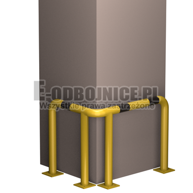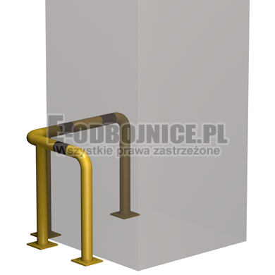 Odbojnica przemysłowa narożna wykonane z rur 60,3 mm, lakierowane proszkowo na kolor żółty , pasy z czarnej foli odblaskowej I-generacji. Służą one do zabezpieczenia ścian, urządzeń, traktów komunikacyjnych, słupów w powierzchniach produkcyjnych, magazynowych i sklepowych. Stopy wykonane z blachy o gr. 8 mm z czterema otworami montażowymi o średnicy 10 mm. Wysokość i długość ramion do wyboru.