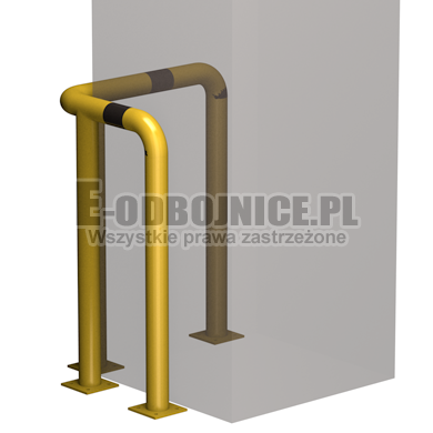 Odbojnica przemysłowa narożna wykonane z rur 76,1 mm, lakierowane proszkowo na kolor żółty , pasy z czarnej foli odblaskowej I-generacji. Służą one do zabezpieczenia ścian, urządzeń, traktów komunikacyjnych, słupów w powierzchniach produkcyjnych, magazynowych i sklepowych. Stopy wykonane z blachy o gr. 8 mm z czterema otworami montażowymi o średnicy 10 mm. Wysokość i długość ramion do wyboru.