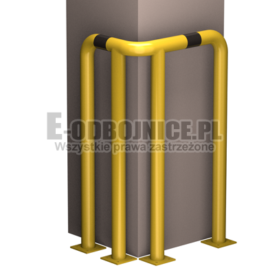 Odbojnica przemysłowa narożna wykonane z rur 76,1 mm, lakierowane proszkowo na kolor żółty , pasy z czarnej foli odblaskowej I-generacji. Służą one do zabezpieczenia ścian, urządzeń, traktów komunikacyjnych, słupów w powierzchniach produkcyjnych, magazynowych i sklepowych. Stopy wykonane z blachy o gr. 8 mm z czterema otworami montażowymi o średnicy 10 mm. Wysokość i długość ramion do wyboru.