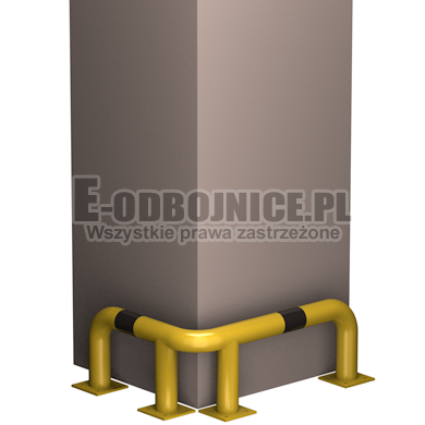 Odbojnica przemysłowa narożna wykonane z rur 76,1 mm, lakierowane proszkowo na kolor żółty , pasy z czarnej foli odblaskowej I-generacji. Służą one do zabezpieczenia ścian, urządzeń, traktów komunikacyjnych, słupów w powierzchniach produkcyjnych, magazynowych i sklepowych. Stopy wykonane z blachy o gr. 8 mm z czterema otworami montażowymi o średnicy 10 mm. Wysokość i długość ramion do wyboru.