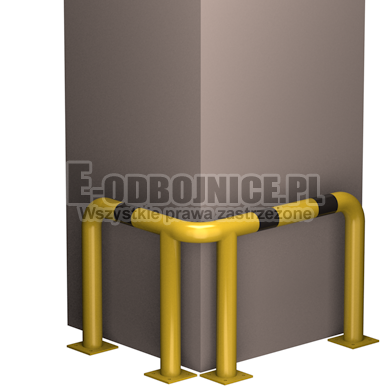 Odbojnica przemysłowa narożna wykonane z rur 76,1 mm, lakierowane proszkowo na kolor żółty , pasy z czarnej foli odblaskowej I-generacji. Służą one do zabezpieczenia ścian, urządzeń, traktów komunikacyjnych, słupów w powierzchniach produkcyjnych, magazynowych i sklepowych. Stopy wykonane z blachy o gr. 8 mm z czterema otworami montażowymi o średnicy 10 mm. Wysokość i długość ramion do wyboru.