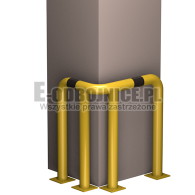 Odbojnica przemysłowa narożna wykonane z rur 76,1 mm, lakierowane proszkowo na kolor żółty , pasy z czarnej foli odblaskowej I-generacji. Służą one do zabezpieczenia ścian, urządzeń, traktów komunikacyjnych, słupów w powierzchniach produkcyjnych, magazynowych i sklepowych. Stopy wykonane z blachy o gr. 8 mm z czterema otworami montażowymi o średnicy 10 mm. Wysokość i długość ramion do wyboru.