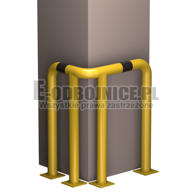 Odbojnica przemysłowa narożna wykonane z rur 76,1 mm, lakierowane proszkowo na kolor żółty , pasy z czarnej foli odblaskowej I-generacji. Służą one do zabezpieczenia ścian, urządzeń, traktów komunikacyjnych, słupów w powierzchniach produkcyjnych, magazynowych i sklepowych. Stopy wykonane z blachy o gr. 8 mm z czterema otworami montażowymi o średnicy 10 mm. Wysokość i długość ramion do wyboru.