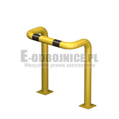 Odbojnica przemysłowa U-2, średnica rury 76,1 mm, lakierowana proszkowo na kolor żółty, pasy z czarnej foli odblaskowej I-generacji. Służą one do zabezpieczenia słupów, ścian, urządzeń, rur itp... Stosowane na powierzchniach produkcyjnych, magazynowych, parkingowych itp.... Odbojnica jest osadzona na trzech nogach. Każda stopa posiada cztery otwory montażowe o średnicy 10 mm. Stopa wykonana z blachy grubości 8 mm.